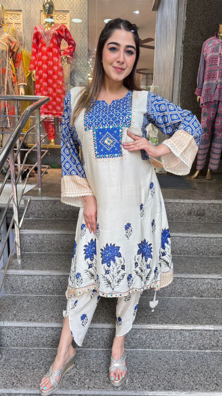- Top Design: White tunic with blue floral embroidery